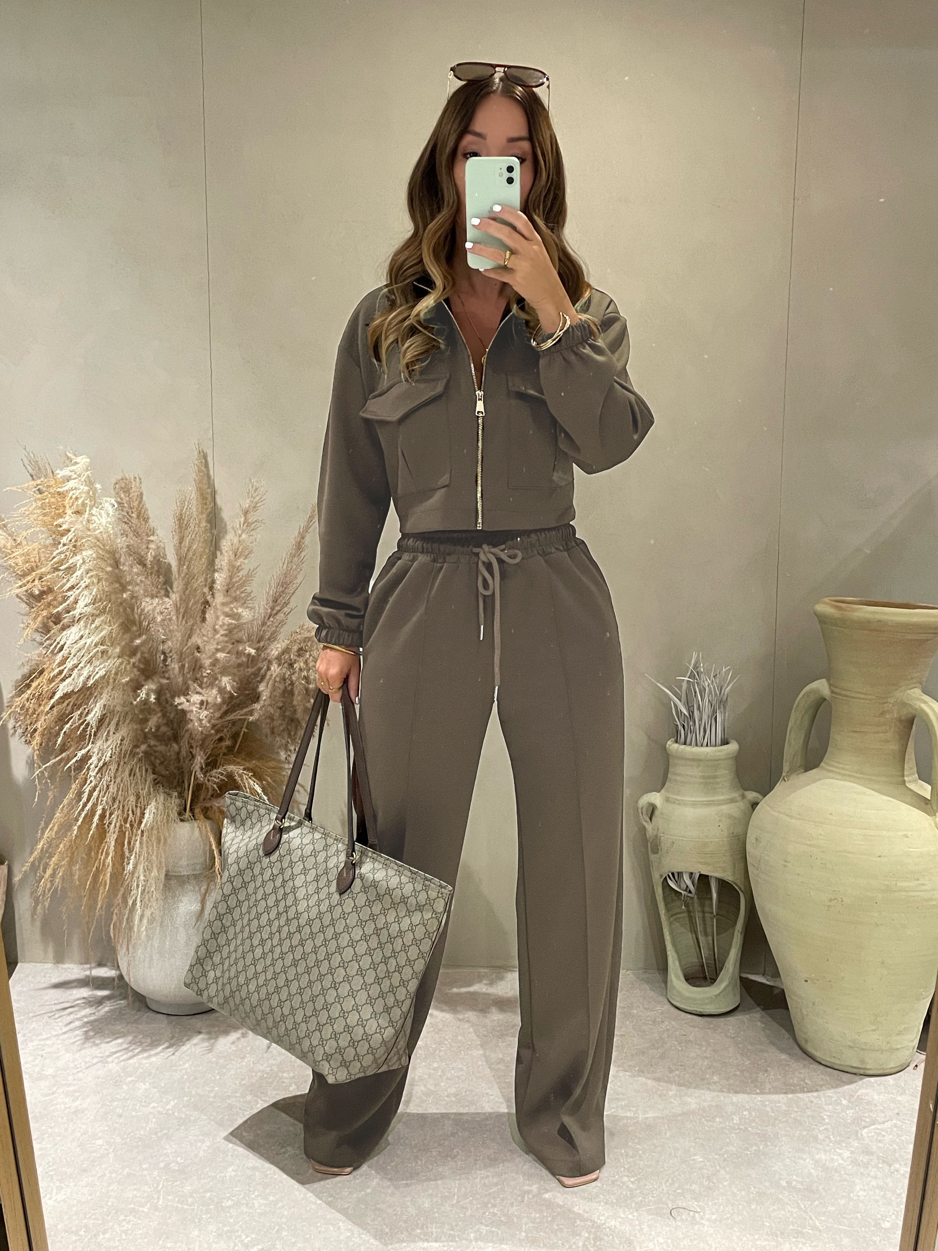 The Mimi Set. Long sleeve top with zip front, loose fit and ribbed detailing. Straight leg trousers with elasticated waistband. Longer length not suitable for petite