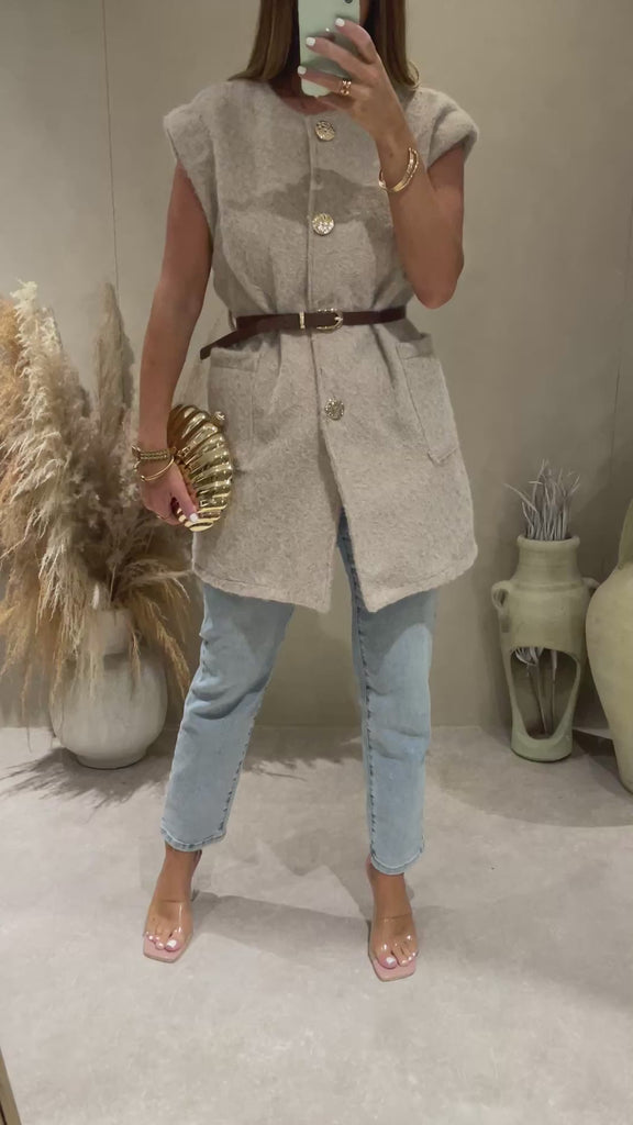 The Kelly Gillet, Waistcoat style gillet, longline, sleeveless, belt to front, pockets, oversized fit, and textured material.