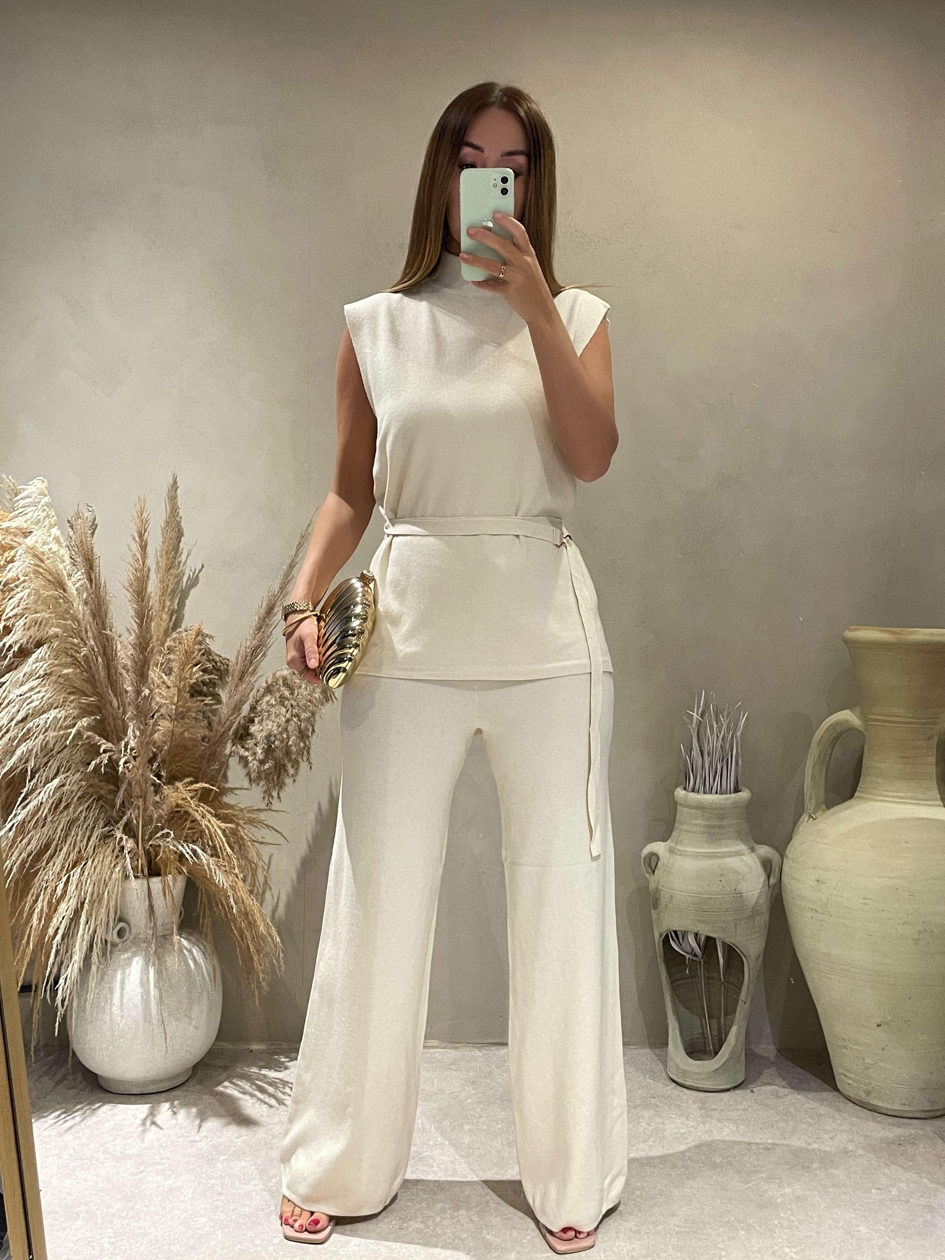 The Ashley Set. Relaxed fit style top with high round neck and split side detail. Straight leg trousers with elasticated waistband and slight flare. Very stretchy!