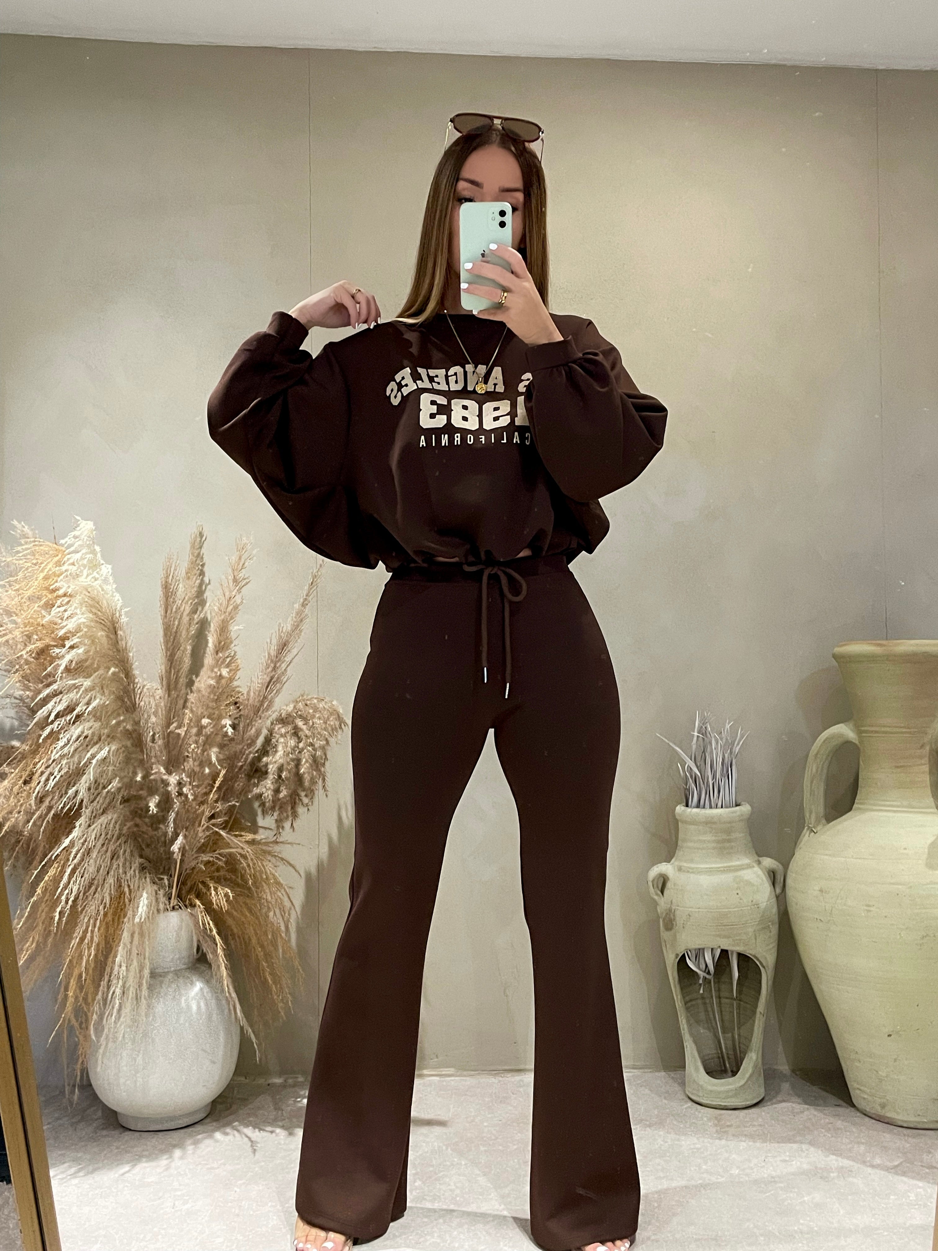The Debbie Set. Long sleeve top with logo front, loose fit and tucked waist. Straight leg trousers with elasticated waistband and slight flare. length not suitable for tall’