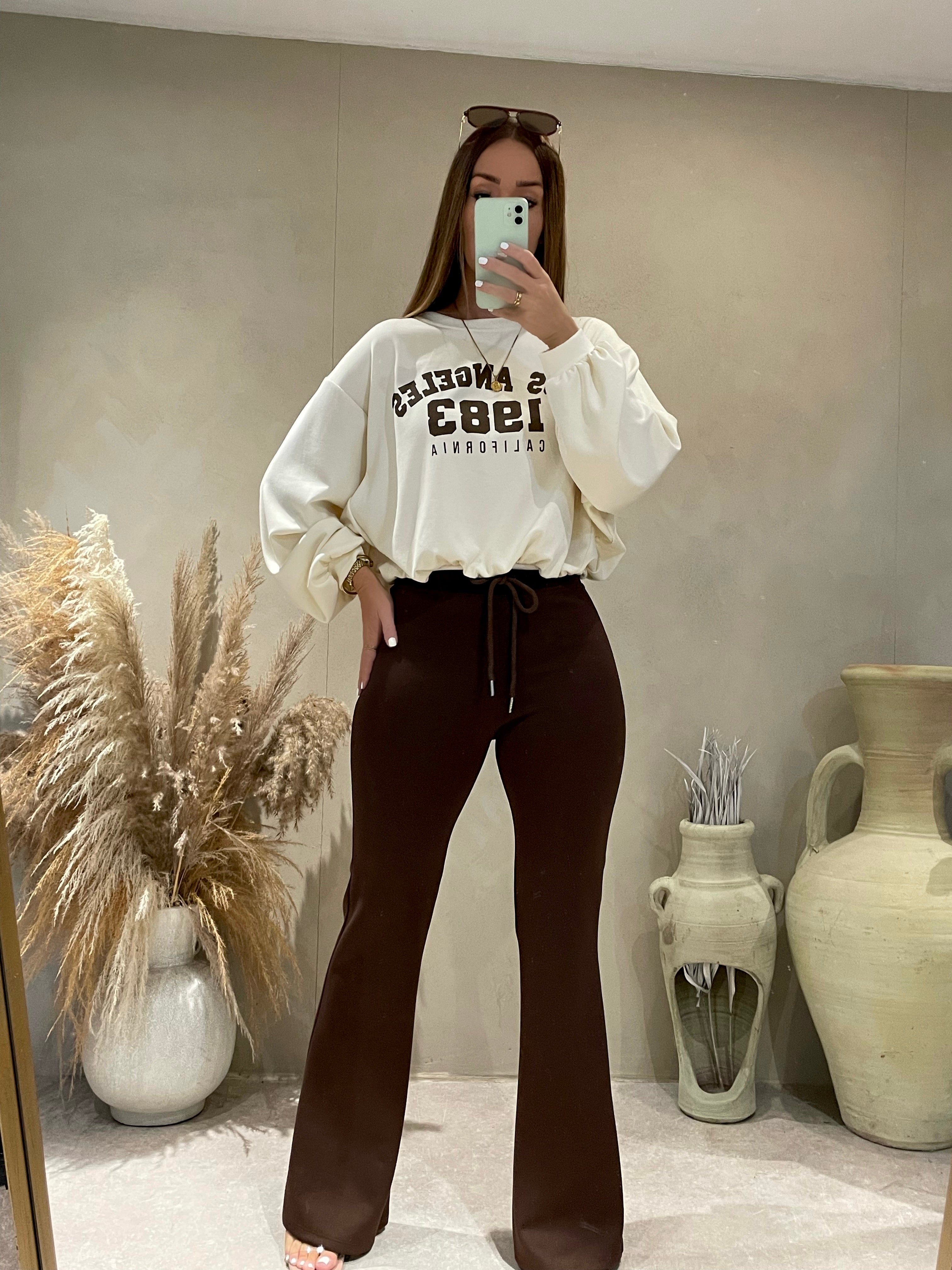 The Debbie Set. Long sleeve top with logo front, loose fit and tucked waist. Straight leg trousers with elasticated waistband and slight flare. length not suitable for tall’